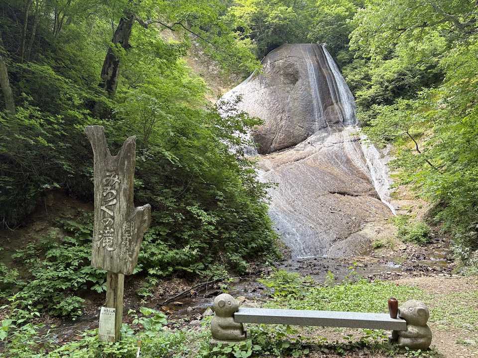 青森県田子町夏坂みろくの滝を紹介します田子町から車で20分程度ですみろくの滝入口ブナ林の中の遊歩道を200mほど進みますみろくの滝に到着です高さ約30m、幅約20m水しぶきを浴びると涼しくなりますよん?何かに似てない?スヌーピー‼️水量によって流れも変わります岩肌を流れる滝の水に癒されます近くに休憩所もあります数日前やや渇水時の写真流れが違うでしょ季節ごとに景色も変わりますよアクセスは車だけですが行く価値ありますみろくの滝