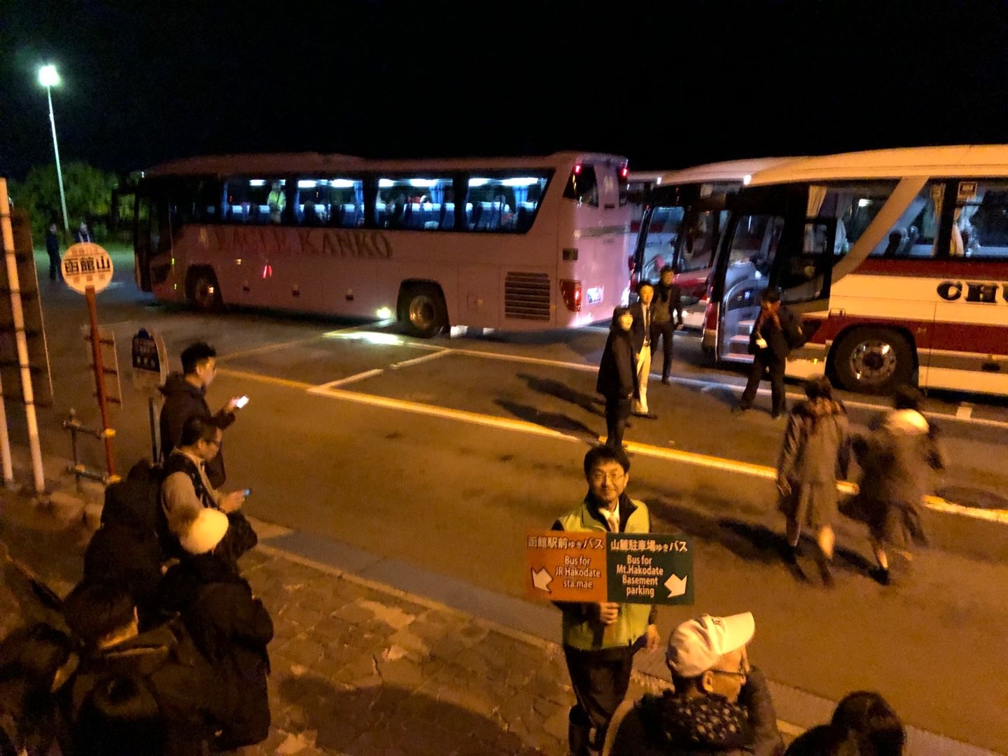 18時に山頂に到着したら、帰りのバス待ちの行列がすごいです。パパッと写真撮って、すぐに行列の一番後ろへ。激混みですが、函館駅前行きよりは、ロープウェイ山麓駅駐車場行きが若干空いています。