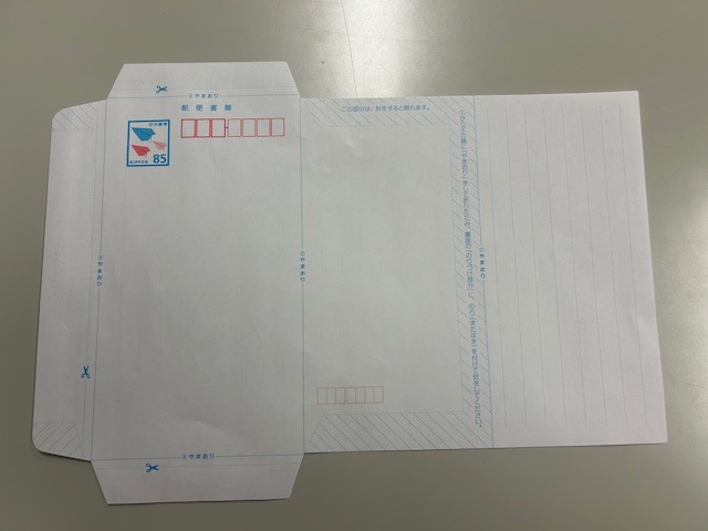 みなさんは、「郵便書簡」ってご存じですか? これが郵便書簡です。要するに、「封筒」「切手」「便箋」が一つになったものです。 こんな感じで便箋のようになっていますよね。 使うときは、便箋部分に書き込みをしたらこのように折りたたんで・・・。 糊付けしてポストにインするだけです。 郵便書簡ははがきと同じ85円で、はがきの三倍書くことができるというお得なものとなっておりますが、認知度は今一つなのかな・・・。先日の郵便料金値上げにより、もしかしたらひっそりとなくなってしまうかも、って思ったのですが、何とか残ってくれています。 これとよく似たものに、「航空書簡」というものがありまました。これは世界各国にわずか90円で送ることができるというかなりお得なものでした。しかし、2023年9月30日付で販売終了になったとのこと。もしかしたら、郵便書簡もその流れになってしまうのか・・・。 私は学生時代には、よくこの郵便書簡を使っていました。今のように電子メールもない時代、手紙を書くときにいちいち便箋や封筒を買う必要がなく、オールインワンなのですから重宝していました。しかも、25gまでの重さであれば封入することができるというのもありがたいんですよね。 そんな私も何年ぶりに郵便書簡を買ったのかな・・・。妻と付き合っているときに旅先から風景スタンプを押して送った時以来かも。今回購入したのは、北九州に住む息子にカードを送る要件があったのですが、その程度なら郵便書簡で十分だなぁと思って買いもとめたものです。受け取る息子も見慣れない郵便物にびっくりするだろうな・・・。