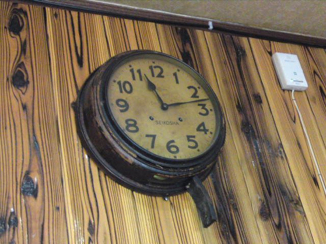 お店の方にお話をうかがうと、この時計は1935年にお店を移転した際に常連さんがプレゼントしてくれたものだそうです。文字盤には、SEIKOSHA(精工舎)と書かれていまして、時計本体のしたの方に口が空いたようになっていますが、そこからコチコチ音の正体である振り子が見えました。
