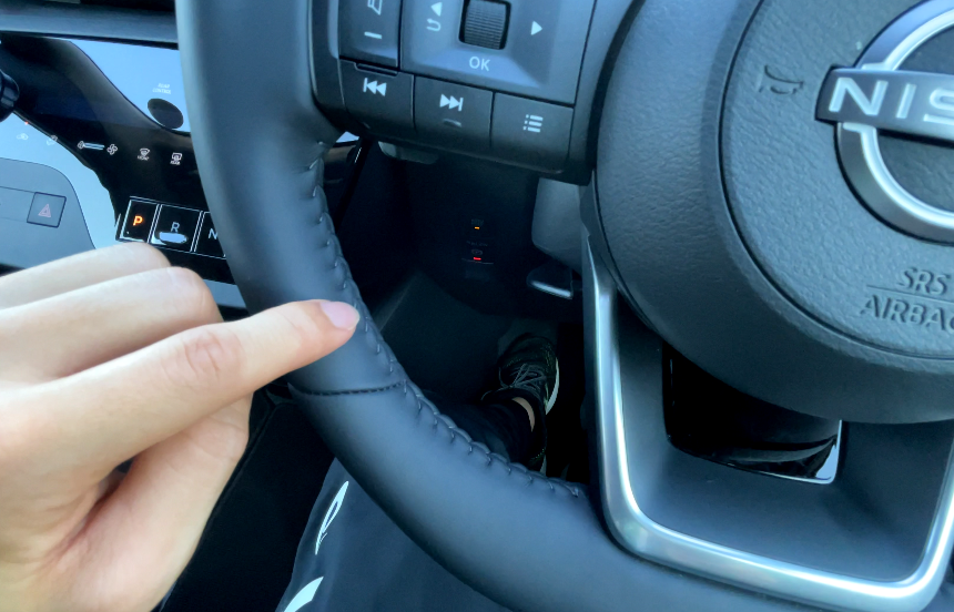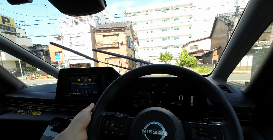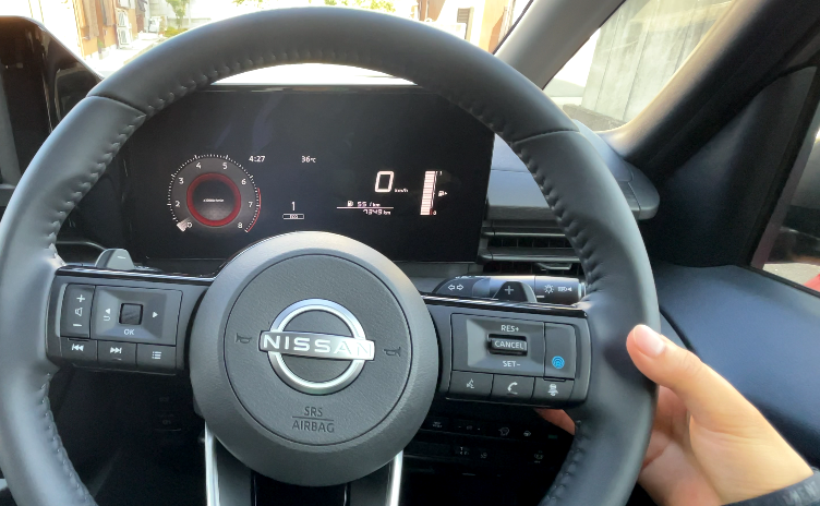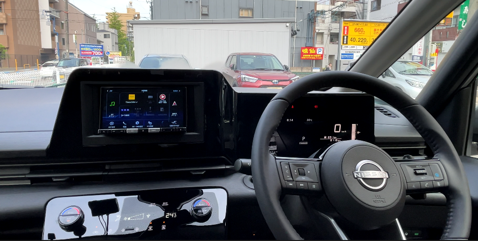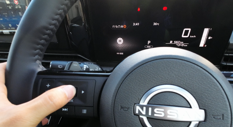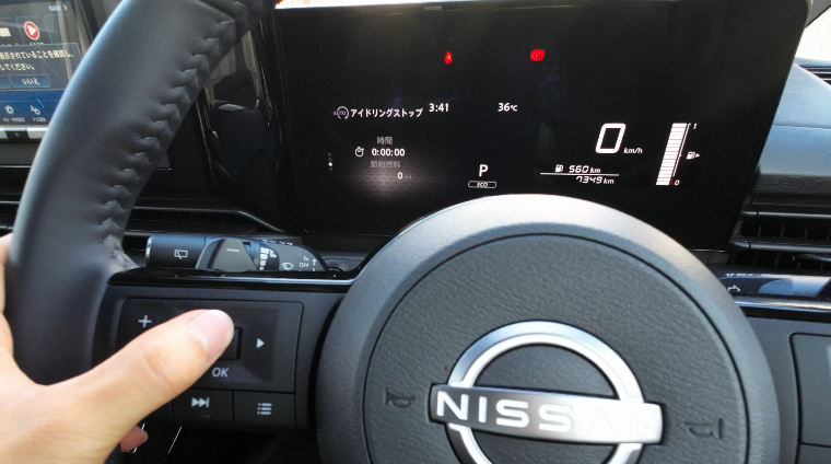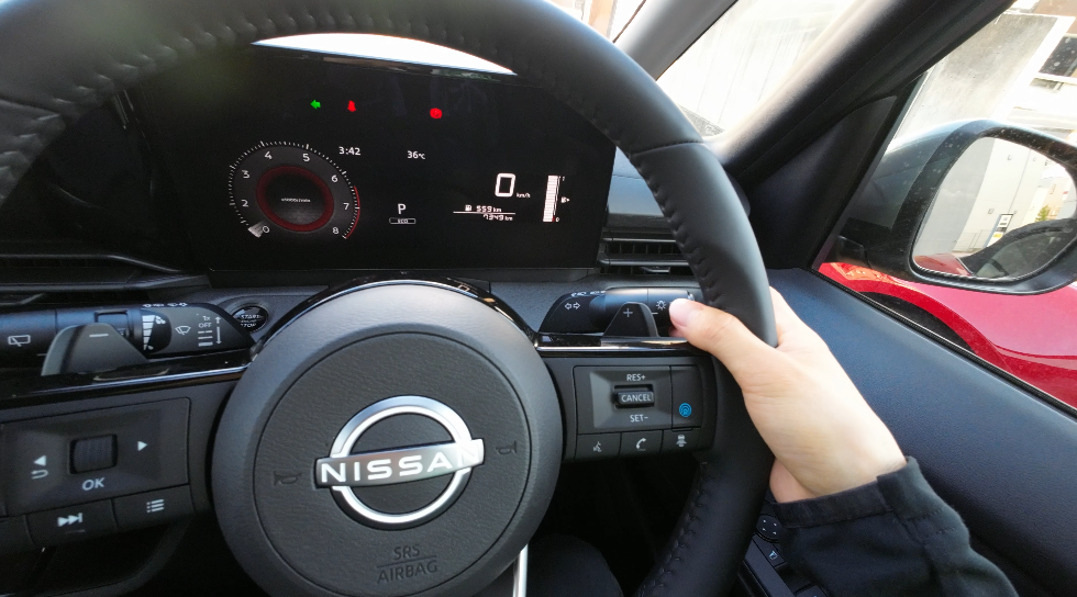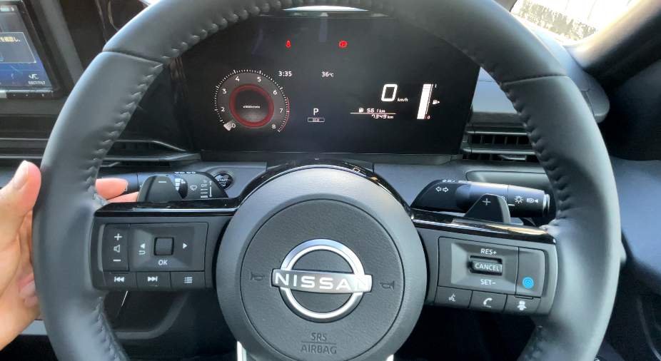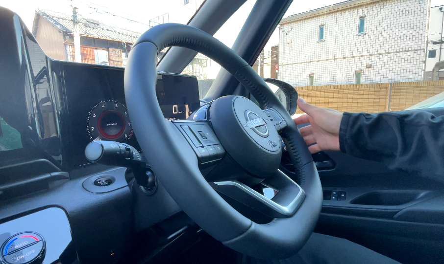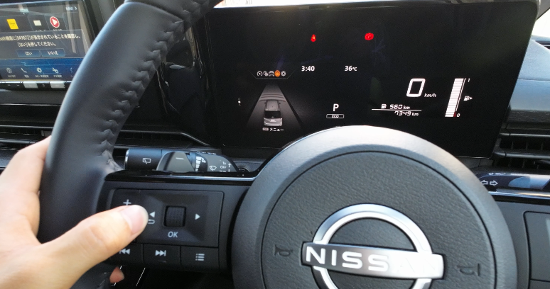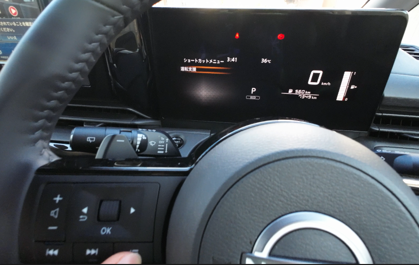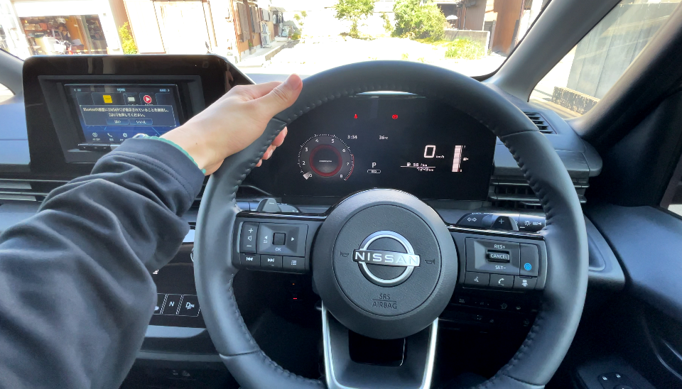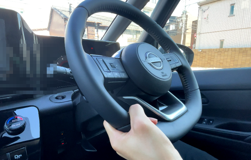 ほぼ垂直のメーター画面に対してステアリングが斜めで、少し違和感を感じるかもしれません