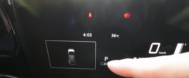 右側:小さな液晶画面に速度、走行距離、後続可能距離、燃料系