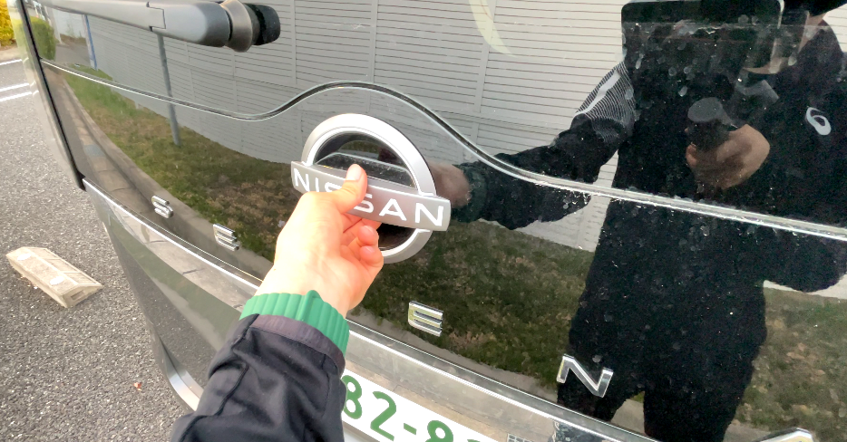 日産のエンブレムの下にあるスイッチを押すと、上半分だけ開けることが可能