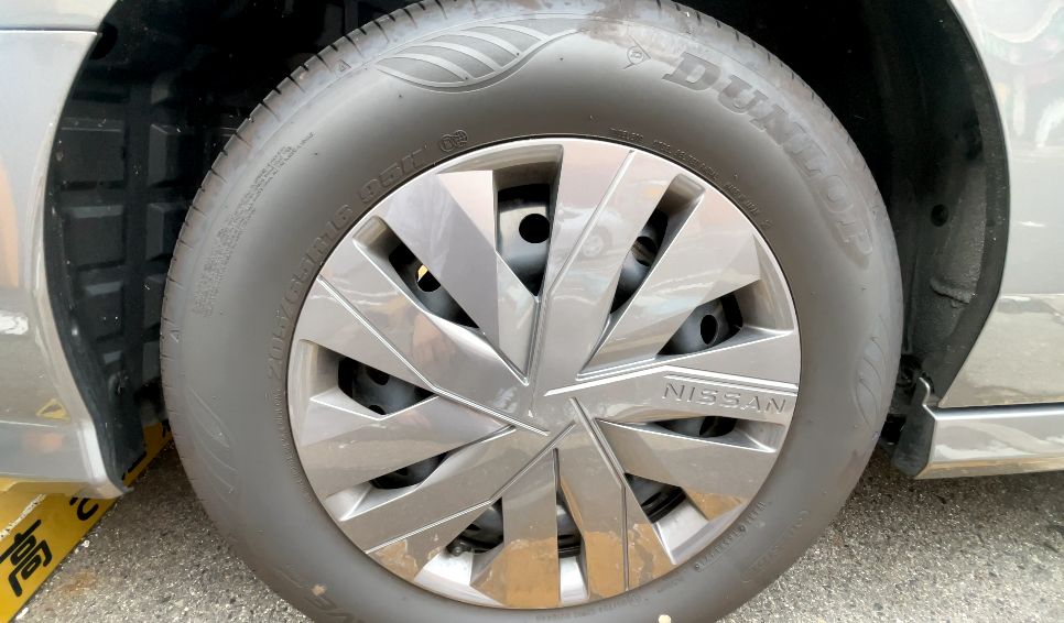 鉄チンホイールにキャップを被せたデザインで、中央ではなく横の部分に "NISSAN" の文字があります