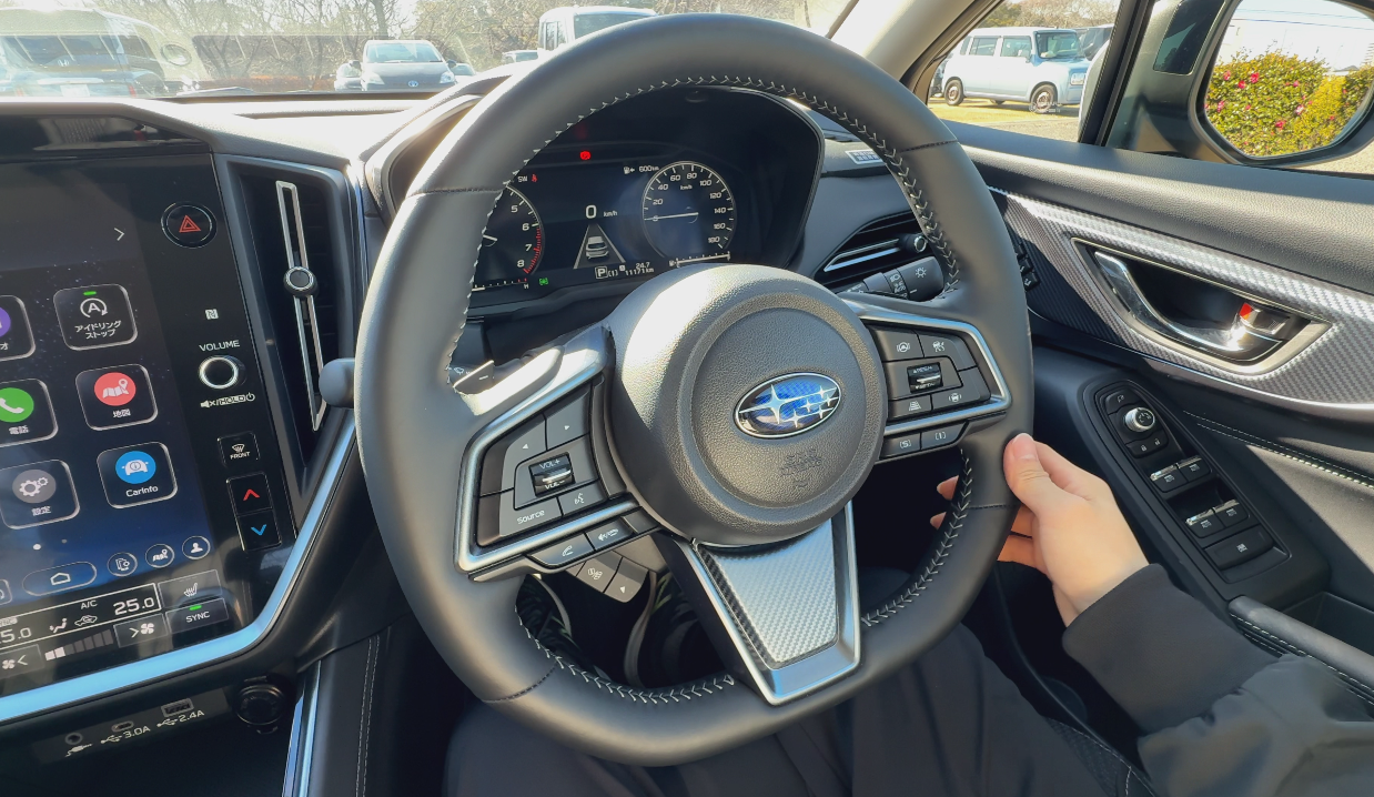 革巻きステアリングで2時、10時部分は握りやすいよう膨らみあり。