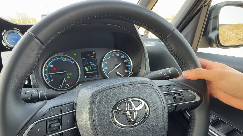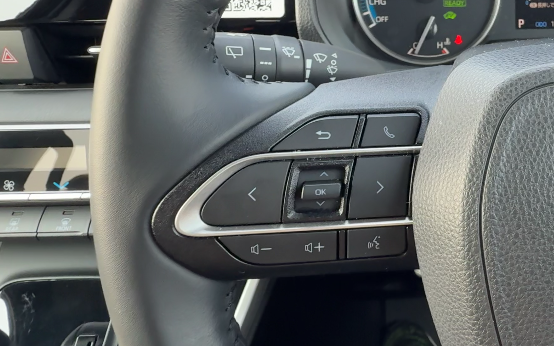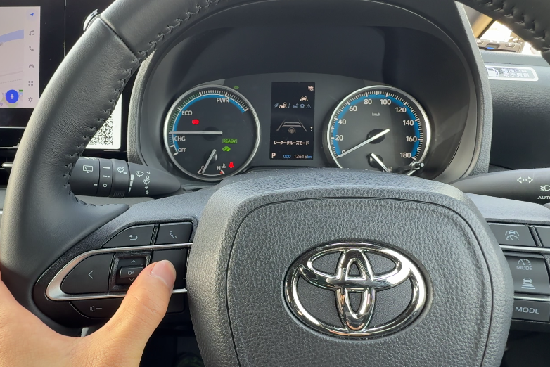 左側にはメーター画面切り替えスイッチ、電話・音声コマンド呼び出しボタン、オーディオ音量調節スイッチを配置。