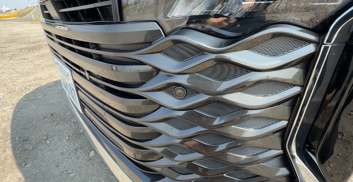 横長のグリルが特徴的で、中央と周囲にメッキ加飾が施され、高級感を演出。