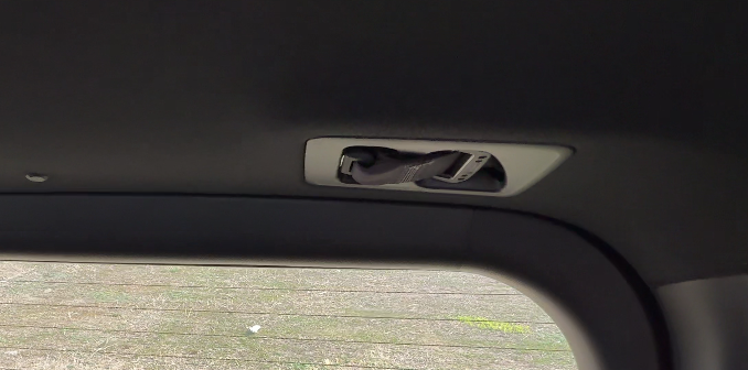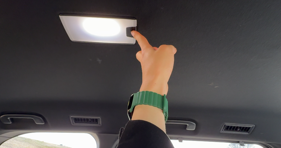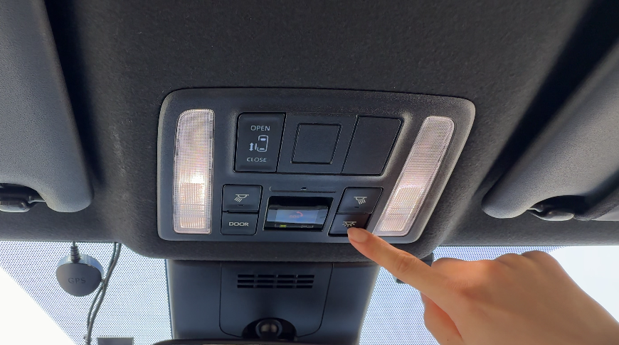 天井中央にはSOSスイッチ、手前には電動スライドドアの開閉スイッチを配置。
