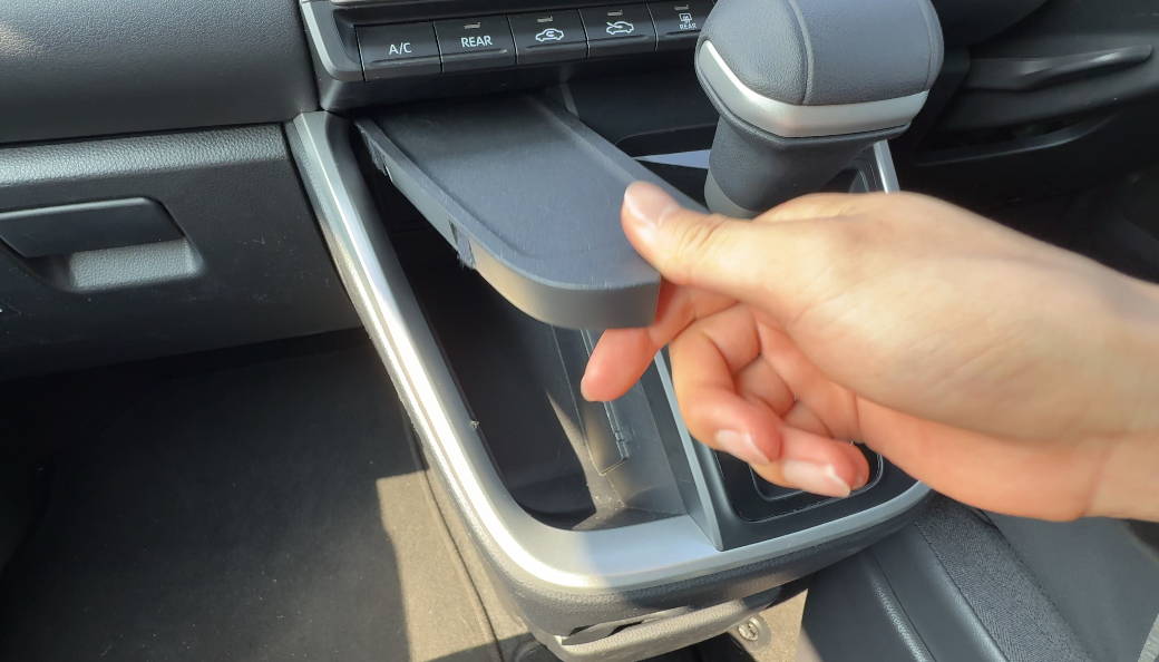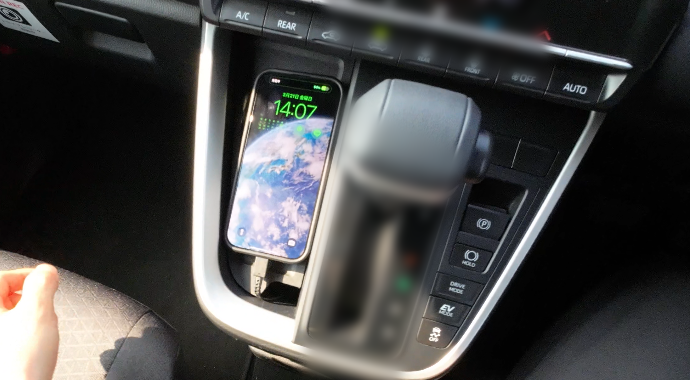シフトレバー左側には、スマートフォン置き場とケーブル収納スペースを配置。