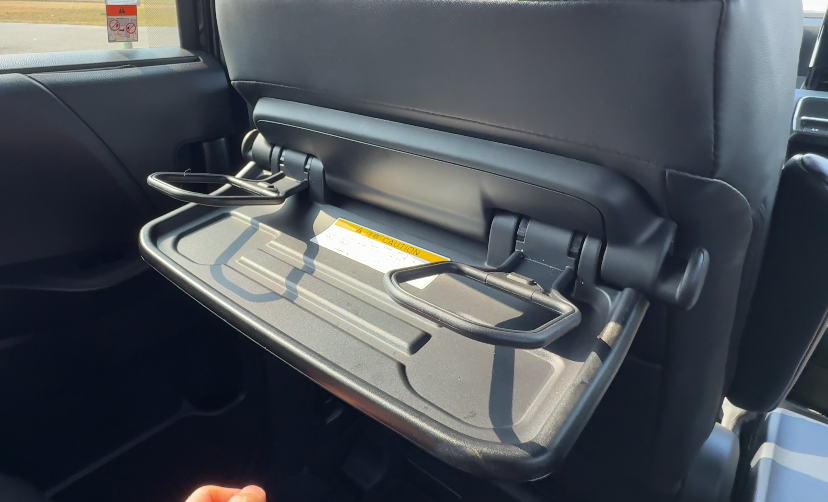 助手席背面には、テーブルとドリンクホルダー、両側にフック、