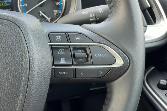 右側にはクルーズコントロール関連スイッチ、オーディオのモード切り替え、スキップ、巻き戻しボタンを配置。
