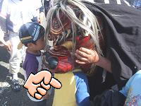 飴ゲットの祭り?「春の大祭」へ行ってきました。今日の大田市は、祭りにはもってこいの(少し暑いぐらい)よい天気です。まず、獅子舞に次男が 「ガブリ」 。これで、良い子になること間違いなし。お神輿登場次に、大浦の銀座通りに、待ちに待った「山車」が登場。その「山車」を、五十猛町の子供達みんなで、 「エイヤー・エイヤー」の掛け声で車の付いていない大きな「山車」を引っ張ります。時々「山車」を止めては、「山車」の上から、飴を「ドサ・ドサー」。その飴を拾うのは、なかなか大変。でも、つーちゃん家族はがんばりました。全員で、50個以上は拾ったかも。当分おやつは、飴です。つーちゃん家族の中で、一番お祭りを楽しんだのは長男で、「飴もう無いんだってー。だから、もう帰る。」だって。まさに、「飴とムチ」です。