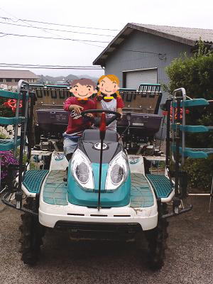 本日つーちゃん家族の代表選手として、つーちゃんパパが田植えに出動してくれました。今年の田植えは、新型田植え機が初出動です 長男・長女は、試乗させてもらい、将来に備えています。後継ぎはOK? この、新型の田植え機は、クボタのWELSTAR NSU65です。 今までは、代かきの時に肥料を散布していたのですが、この田植え機は田植えの時に行ってくれるのですって農業の世界もどんどん進歩していますね。 当然肥料は、つーちゃんママの大好きなJAから販売されている有機一発077です。 つーちゃんパパは、稲苗を苗代から田んぼに輸送して、田植え機のドライバーに渡すという最も過酷で重要な任務を任されていました。(肉体労働担当とも言う) つーちゃんパパはこのようにして、苗を運んでいました。 田植え機担当者によりこのように真っすぐに苗が植えつけられていきました。 ↓ この田植え機の植えるスピードが速かったと、つーちゃんパパが喜んで教えてくれました。 何でも、隣の田で近所のおじさんが4条植えの田植え機で同じくらいの大きさの田で田植えをしていたのですが、その田んぼ1枚を植える間に、この新型の田植え機(6条植え)は、2枚の田んぼの田植えを済ませてしまいました。すごく早いですね! 今日は、コシヒカリを1.07ha(ヘクタール)≒1.07町(ちょう)、もち米を0.71ha(ヘクタール)≒0.71町(ちょう) 田植えをして終了しました。 当然のことながら、任務を全うした、つーちゃんパパは泥だらけになって、戻って来ました。 今回のミッションは、つーちゃんパパとそのお兄ちゃん、そして従姉のお兄ちゃんの3人で行いました。あ!おじさんも手伝ってくれていましたねお疲れ様でした