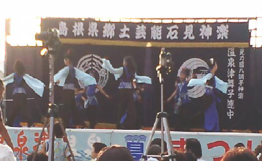 ゆのつ温泉夏祭り で、つーちゃん長女が よさこい踊り を楽しんできました。久々の本番でしたが、笑顔で楽しく踊れていました。(親バカですが・・・)ゆのつ温泉夏祭りは、今回で38回目という事ですが、つーちゃんママ以外は初めての参加でしたが、とても賑やかで楽しいお祭りでした。屋台も沢山出店していて、つーちゃん家族お気に入りの「三瓶バーガー」も出店していましたよ。本日限定の「あなごバーガー」が販売していて、限定好きのつーちゃん家族は、もちろん「あなごバーガー」ゲットです。甘めの味付けで、美味しかったのでメニューに取り入れてほしいものです。もちろん、「さんべバーガー」も売っていました。先日、つーちゃんママがお世話になった、温泉津焼きのお店も出店していたので、立ち寄ってみました。長女が気に入って買ったのが、このパンダの置物です。可愛いでしょー。風鈴も素敵で、自分で作る事も出来るらしいです。最近全国でブーム?の神楽社中が6チーム参加していて、子供達は神楽に釘付けです。長女のクラスメイトの所属している「土江子ども神楽団」も出場していたのですが、つーちゃん家族が、到着していた時には既に終わっていたのでした・・・。でも、仲良く最後まで一緒に祭りを楽しんでいました。神楽の最後はやっぱり「大蛇」でした。間近で見る大蛇は何度見ても感動です。PM8時~は、夜空に花火も上がり、初めて打ち上げ花火を間近で見る子供達は、興奮状態でした。頭上に上がる花火が落ちてくるのを待って、手を広げて待っていた次男でした。でかすぎて、はみ出してしまいました。つーちゃん家族の夏の楽しい思い出になりました。また、来年も行きたいな。 【 予 告 】海神楽:8月16日(日)17時~22時 温泉津町福光海岸にて 京都造形芸術大学の学生によって構成される京都瓜生山舞子連中と石見神楽温泉津舞子連中による神楽が、海岸で神楽が見られるなんて、また神秘的ですね。にまごいせ祭り:8月13日(木)17時~21時 仁摩健康公園(仁摩サンドミュージアム)にて こちらも、素敵な花火があるそうです。