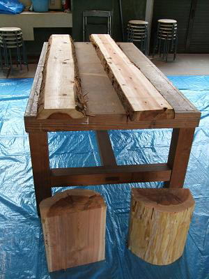 今日、つーちゃんママと長女の二人で前回も参加した「水と緑の森づくり みんなで森へ行こう2009」の第二回木工体験に参加してきました。第一回森林伐採見学・体験 植樹体験はこちらまず、用意してあった材料はこちらまずは、木材の皮を剥ぐところからです。つーちゃんママは「ここからー」と、心の中で叫んでしまいましたが、案外皮がペロペロペローと剥けると気持ちが良く楽しかったです。ちなみに長女は、皮剥ぎが一番楽しかったようですよ。次は、面取りです。木材全部の面取り、もちろん表面もです。電動サンダーが重くデコボコがあると、手から離れそうになるので支えているだけで腕がパンパンになりました。でも、見る見る丸みが出てピカピカになるので夢中になってしまいます。次は、裏面のつなぎの部分の作成です。のこぎりは、前回の伐採体験の時に使っていたので大丈夫?と思っていたのですが、なかなか上手には切れません。電動ドリルを使って、釘を打ち込みますが、速さと重さに振り回されて、的外れの穴が・・・。組み立ての最後は、裏面と板を木の杭で繋ぎます。穴を開けます。杭打ちです。半分までは、長女が担当で、後半の力がいるところはつーちゃんママの担当でした。剣道部の素振りを思い出します。お弁当を食べた後、2基目を造ってから、防腐剤を塗りました。完成でーす。今日つーちゃんママと長女が造ったベンチ2基は、長久小学校に寄贈して頂けるとの事ですが、なんせ素人が造ったので安全基準が整っていないので今から許可を貰わないといけないそうです。置いて頂けるといいなー。今日は、大田市でも老舗の生越工務店の腕の良い棟梁が親切丁寧に教えて頂いたので、誰よりも立派なベンチが出来ました。ありがとうございました。(自画自賛ですが。)もの造りが大好きな長女にとって、とても楽しい体験となりました。