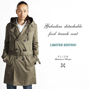 SLICK専門店butterfly caughtから☆オフィシャルストア限定☆●2月中旬入荷予定・予約販売商品●【送料・代引手数料/無料】SLICK...オフィシャルストア限定で、コットン100%の密で丈夫な綾織”ギャバ”を使用したトレンチコートが登場しました!程よいハリとツヤで上品なイメージに仕上がっています。フードは取り外しが可能になっており、付けたままだとカジュアルな雰囲気を、外せばスッキリとしエレガントな雰囲気をお楽しみいただけます。その時々のスタイルに合わせてイメージを変えられる着回しの効くコートです。襟を立てて見えるチンストラップや、胸元のガンパッチ、アンティーク調でオリジナルな表情を持ったアイレット・Dカン・ホックなど、こだわりのディテールにも注目。身頃・フード裏にはスレキ、袖裏にはポリエステル素材の裏地を使用しているので、適度な保温性があります。ベーシックなブラックとベージュカーキの2色展開ですので、春はもちろん秋にも活躍してくれます細身にデザインされたシルエットはボディにフィットとし綺麗なラインを作りだしてくれるので、上品な着こなしがお楽しみいただけます By butterfly caught