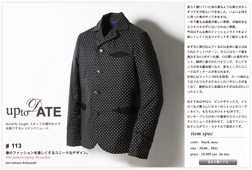 butterfly caughtオフィシャルストア限定SLICK(スリック) ドットパターンパイピング4Bジャケット ☆オフィシャルストア限定☆【送料・代引手数料/無料】SLICK(スリック)ドットパターンパイピン...小さなドットがプリントされれた、ユニークで可愛らしい雰囲気のジャケット。コットン素材の一枚地で作り上げていますので、これからのシーズンに合わせやすい一着ですカジュアルな4つボタンデザインですが、タイトなシルエットと落ち着いたネイビーとブラックのカラー使いにすることで、ドレスシャツやスラックスなどにもすっと馴染みます。ネイビーにはエンジの、ブラックにはパープルの総裏仕立てになっているのもポイントです。襟から前立てにかけてと、ポケット口、裾、袖にはパイピングを施し、デザインのさりげないアクセントに。口が開いたように見えるユニークなポケットなど、ディテールにこだわったジャケットです。パーカーなどと合わせればカジュアルな雰囲気が楽しめ、ドレスシャツなどと合わせればエレガントな雰囲気が楽しめ、様々なシーンでお使いいただけます By butterfly caught