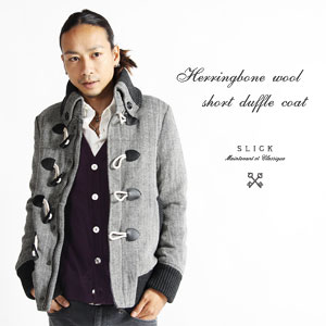 毎度お馴染みのbutterfly caughtより毎年売り切れ必死のダッフルコートをご紹介【送料・代引手数料/無料】SLICK(スリック)ヘリンボーンウールショートダッフルコート【あす楽...【送料・代引手数料/無料】SLICK(スリック)ヘリンボーンウールショートダッフルコート【あす楽...スッキリとしたショート丈と細いシルエットでエレガントな表情に仕上がったダッフルコート。ヘリンボーンウールの質感は暖かみがありながら上品な仕上がりに。厚手の表地に裏地のキルティングを採用し防寒性に優れているのでシャツやカットソーだけでも暖かく、使い勝手の良いコートです。トグルボタンのパッチ部分には本革をあしらい、袖・裾・ネック周りにローゲージのニット素材を使い全体のアクセントにと、様々な部分にこだわりを感じる一枚です。落ち着いたその表情から、スラックスやシャツなどと合わせてドレススタイルに。もちろんデニムなどのカジュアルなスタイルにも取り入れることができ、スタイルを選ばずに使える使い勝手の良さも魅力の一つBy butterfly caught