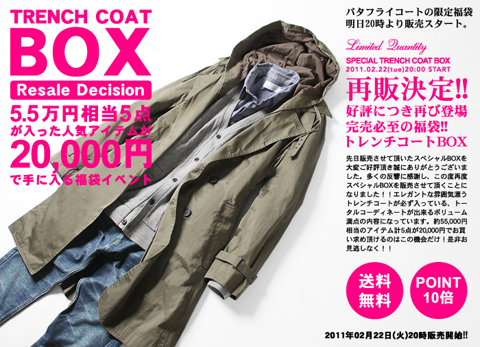 butterfly caughtより再販売決定!!★2011年02月22日(火)20時販売スタート★数量限定バタフライコートの福袋イベントS...<<セット内容>>・エレガントな雰囲気漂う、カジュアル・ドレス共に対応したトレンチコート・幅広いシーズンで着て頂けるVネックカーディガン・ユニークなデザインが印象的なダンガリーシャツ・スウェット素材の抜群の履き心地が魅力のデニム・ブーツやボトムと合わせて足元のレイヤードが楽しめるソックス上記の全5アイテムが入っています。※全ての商品画像において実際に入っているカラー及び商品と異なる場合がございます。<<販売価格>>20,000円総額約55,000円より約65%OFFでお届けします☆さらにポイント10倍です!<<販売期間>>2011年02月22日(火)20時00分 販売開始!!By butterfly caught