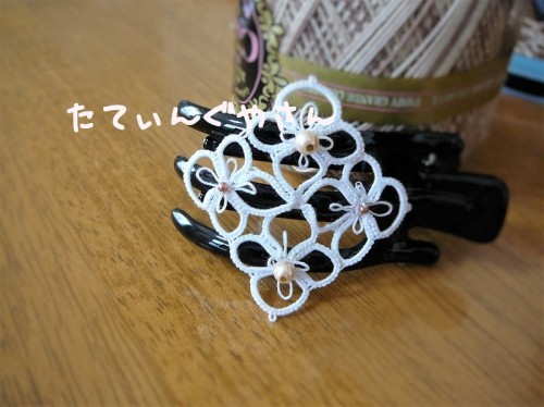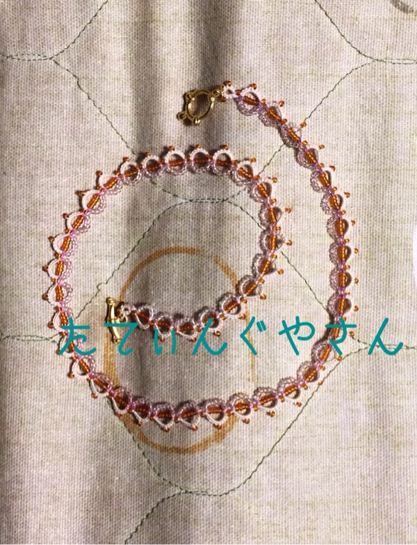行く先々で作っていますと シャトルのみで作れるパターンが重宝します。何が何でもシャトルだけでやるという志ではないです。 考えるのは楽しいですが♪ 左右で対象ちょっときつかったかも~(笑) 面白がってなんでもやるもんではないかもしれませんがビーズが揺れるとこがお気に入りです
