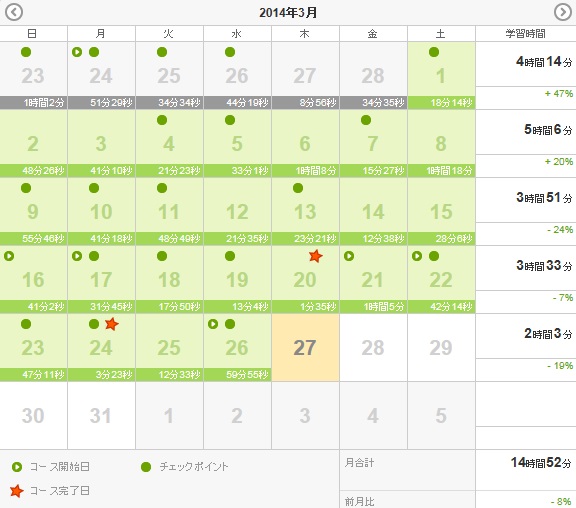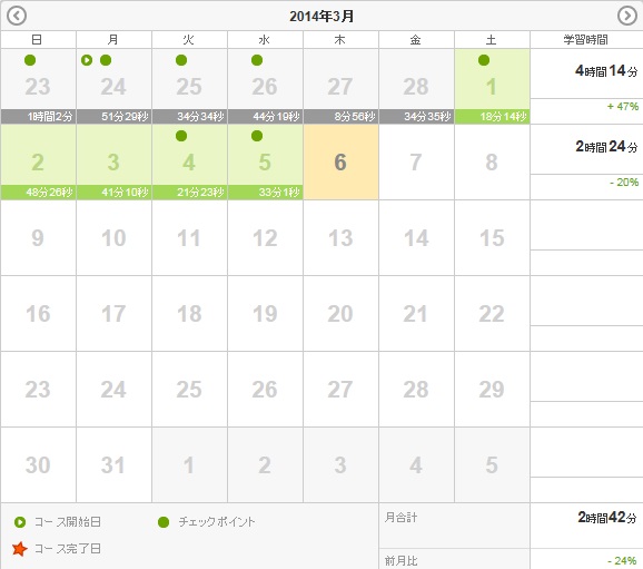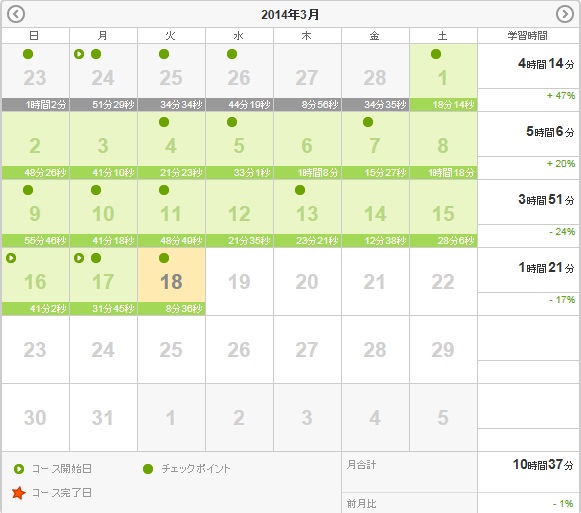 人気blogランキングへ昨日は浦和・名古屋で勝負。何とかプラスで終える事ができて一安心。今週末は久々の休日出勤、労苦がこうした形で還元されるのは嬉しい。しっかり仕事して見返りがあるのがあるべき姿、この調子でいきたい。来月、また試験を受ける。勉強もしっかり続けよう。それと、人間ドックに向けて減量も追い込みだ!3月17日(月):ラジオ35分・聞き流し80分3月18日(火):ラジオ50分・聞き流し80分3月19日(水):ラジオ45分・聞き流し80分・留学40分3月20日(木):ラジオ20分・聞き流し80分3月21日(金):ラジオ75分・聞き流し80分・予習復習30分3月22日(土):ラジオ70分・留学40分・予習復習30分・試験用60分3月23日(日):ラジオ55分・予習復習30分小計:980分+Y213分=1193分累計:1193分
