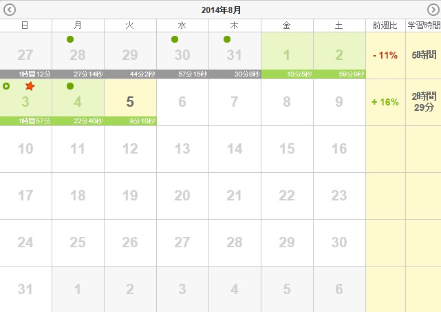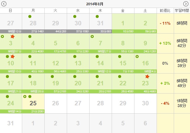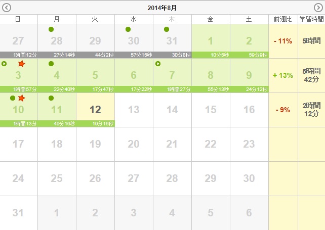人気blogランキングへ涼しくなった後の暑さは体に堪える。幸い、仕事は平和。さっさと帰ろう。無駄に残る必要は無い。8月11日(月):ラジオ50分・聞き流し80分8月12日(火):ラジオ75分・聞き流し80分8月13日(水):ラジオ45分・聞き流し80分8月14日(木):ラジオ60分・聞き流し80分8月15日(金):ラジオ25分・聞き流し80分8月16日(土):ラジオ50分・予習復習30分・試験用60分8月17日(日):ラジオ55分・予習復習30分小計:880分+Y339分=1219分累計:1219分+6417分=7636分※今までの総計15295分(2013年11月~2月)+5043分(2月~3月)+4933分(3月~4月)+8072分(4月~5月)+7919分(5月~7月)=41262分