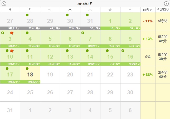 人気blogランキングへ昨日も猛暑一段落。ずっとこんな感じだと良いのだが、、、、涼しくなると眠気が襲ってくる。土日に寝たはずなのに、眠い。逆らっても仕方ない。眠い時は、素直に寝よう。8月4日(月):ラジオ60分・聞き流し80分8月5日(火):ラジオ75分・聞き流し80分8月6日(水):ラジオ60分・聞き流し80分8月7日(木):ラジオ75分・聞き流し80分8月8日(金):ラジオ75分・聞き流し80分8月9日(土):ラジオ45分・留学60分・予習復習30分・試験用60分8月10日(日):ラジオ30分・予習復習30分小計:1000分+Y342分=1342分累計:1342分+5075分=6417分※今までの総計15295分(2013年11月~2月)+5043分(2月~3月)+4933分(3月~4月)+8072分(4月~5月)+7919分(5月~7月)=41262分
