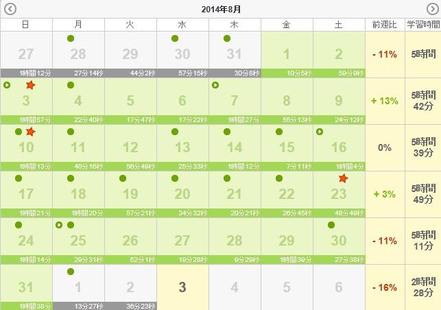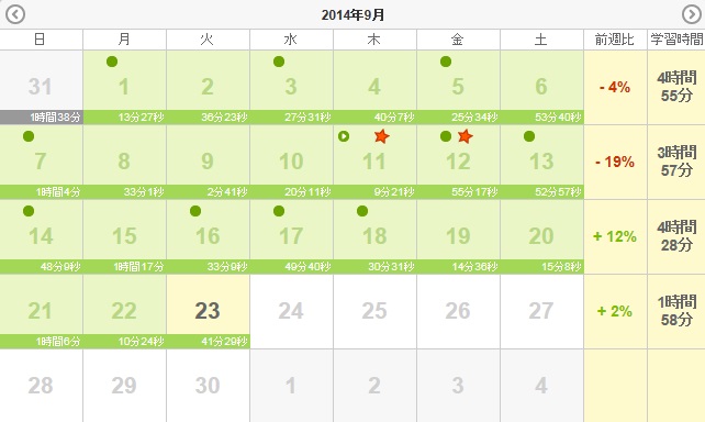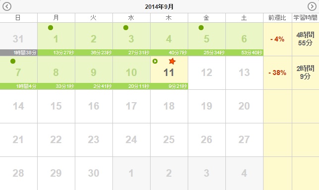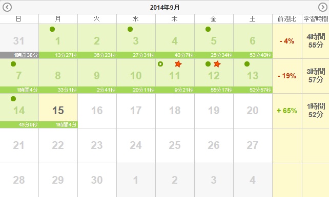 人気blogランキングへ昨日の休み明け。メールが約400通溜まっていたが、大半はゴミ。すべて捌けた。仕事もさほど溜まっておらず(周囲が締切を守っていないため、、、、)、早く帰ることができた。今日以降はどうなるかわからないが、早く帰れるならばそれでよし。年末近くはまた休日出勤有りそうだし。次の試験が再来週に迫っている。今まで通り、しっかり勉強しよう。9月8日(月):ラジオ20分9月9日(火):ラジオ5分・聞き流し80分9月10日(水):ラジオ5分・聞き流し80分9月11日(木):ラジオ20分・聞き流し80分9月12日(金):ラジオ75分・聞き流し80分9月13日(土):ラジオ70分・留学120分・予習復習60分・試験用30分9月14日(日):ラジオ40分・予習復習60分・試験用30分小計:855分+Y237分=1092分累計:1092分+11541分=12633分※今までの総計15295分(2013年11月~2月)+5043分(2月~3月)+4933分(3月~4月)+8072分(4月~5月)+7919分(5月~7月)=41262分