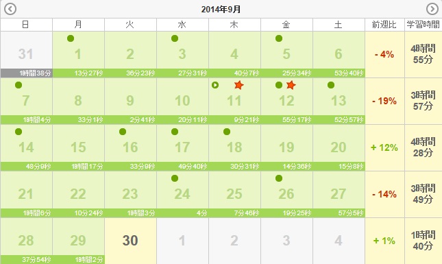 人気blogランキングへ日曜日に試験だったので、勉強時間も一段落。また記録していこう。昨日はまた仕事が熱かった。使えない奴らのケアばかりやっていたら時間がドンドン過ぎる、、、完全に仕事を肩代わりしているので。そいつの給料などを代わりにほしいものだ。9月22日(月):ラジオ5分・聞き流し80分9月23日(火):ラジオ75分・聞き流し80分・予習復習60分・試験用30分9月24日(水):ラジオ45分・聞き流し80分9月25日(木):ラジオ35分・聞き流し80分9月26日(金):ラジオ60分・聞き流し80分9月27日(土):ラジオ30分・聞き流し80分・留学80分・予習復習60分・試験用30分9月28日(日):ラジオ40分・予習復習60分小計:1090分+Y229分=1319分累計:1319分+13921分=15240分※今までの総計15295分(2013年11月~2月)+5043分(2月~3月)+4933分(3月~4月)+8072分(4月~5月)+7919分(5月~7月)=41262分