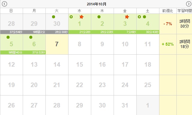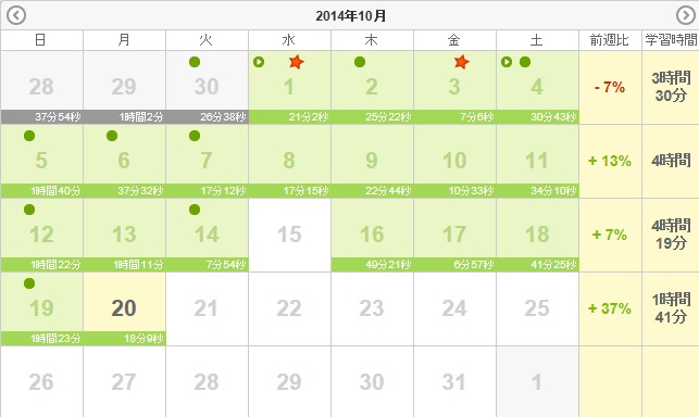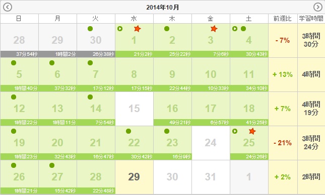 人気blogランキングへ結局、今週は一回も残業せず。これを普通にするため、来週以降も頑張らねば。行きすぎた効率主義は良くないが、無駄ばかりも良くない。今はこの流れを保とう。そして先日の試験結果が来た。点数、着実に上向いている。この調子で勉強続けよう!!10月13日(月):ラジオ125分10月14日(火):ラジオ80分・聞き流し80分10月15日(水):ラジオ50分・聞き流し80分10月16日(木):ラジオ110分・聞き流し80分10月17日(金):ラジオ20分・聞き流し80分10月18日(土):ラジオ120分・聞き流し80分・留学120分・予習復習60分10月19日(日):ラジオ105分・予習復習60分小計:1250+Y259分=1509分累計:1509分+2670分=4179分※今までの総計15295分(2013年11月~2月)+5043分(2月~3月)+4933分(3月~4月)+8072分(4月~5月)+7919分(5月~7月)+15240分(7月~9月)=56502分