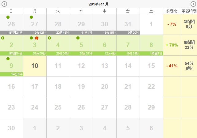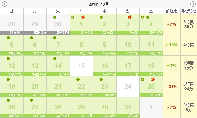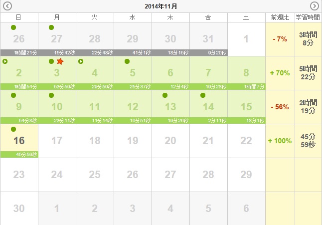 人気blogランキングへ仕事が平和で残業が無いのは本当に素晴らしい。体力気力が充実しているので、仕事も勉強もそれ以外も効率的だ。後はこれが金銭的に結び付けば。。。。試験があったので、勉強がまた一段落。次は2月、更に上を目指そう!11月3日(月):ラジオ145分11月4日(火):ラジオ135分・聞き流し80分11月5日(水):ラジオ120分・聞き流し80分11月6日(木):ラジオ120分・聞き流し80分11月7日(金):ラジオ110分・聞き流し80分11月8日(土):聞き流し80分・留学120分・予習復習60分11月9日(日):予習復習60分小計:1270分+Y322分=1592分累計:1592分+7201分=8793分※今までの総計15295分(2013年11月~2月)+5043分(2月~3月)+4933分(3月~4月)+8072分(4月~5月)+7919分(5月~7月)+15240分(7月~9月)=56502分