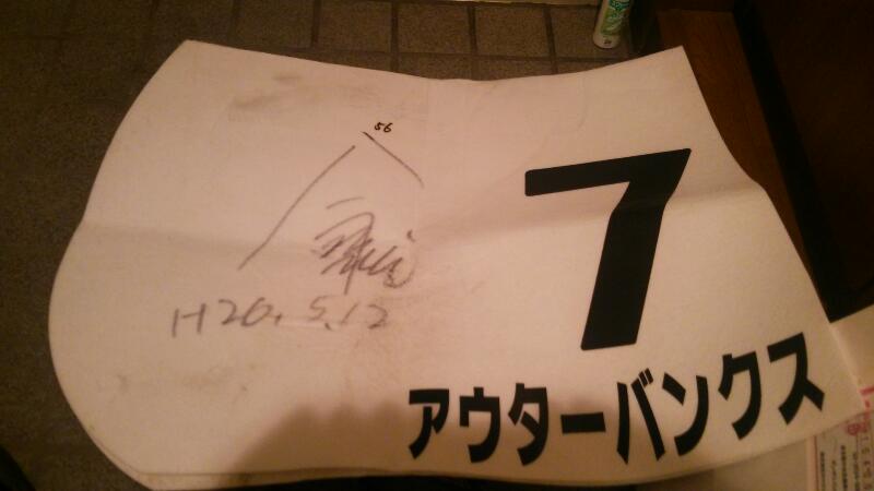 人気blogランキングへシェキナー(今野):4番人気/12着相変わらずスタートが悪い上に道中の行きっぷりがハンパなく悪い。3コーナー前からムチが飛ぶ始末。4コーナーでは早最後方。。。とりあえず放牧かな。精神的にダメになっている可能性も有り。立て直して欲しいが、、、、気温や仕事などを考えると、今年の大井遠征は終わりかな。バンクの勝利の瞬間に立ち会えたのはラッキーだったが、一つ勝つことが本当に難しいのを再認識した。ちなみにその時のゼッケンがこちら。宝物だ