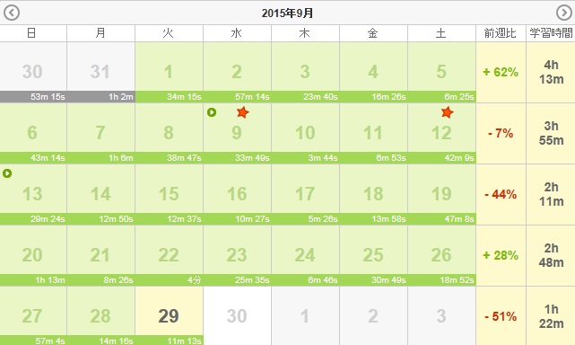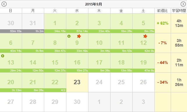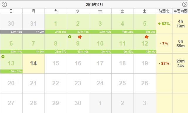 人気blogランキングへようやく英語が一段落。また来年まで頑張ろう。仕事はまだ思ったより忙しくないが、口内炎が痛い。早く帰ろう。9月7日(月):ラジオ145分9月8日(火):ラジオ135分・聞き流し80分9月9日(水):ラジオ120分・聞き流し80分9月10日(木):ラジオ105分・聞き流し80分9月11日(金):ラジオ95分・聞き流し80分9月12日(土):ラジオ120分・留学40分・予習復習60分9月13日(日):ラジオ15分・予習復習60分小計:1215分+Y235分=1450分累計:1450分+35796分=37246分※今までの総計15295分(2013年11月~2月)+5043分(2月~3月)+4933分(3月~4月)+8072分(4月~5月)+7919分(5月~7月)+15240分(7月~9月)+8793分(9月~11月)+20424分(11月~2月)+5413分(2月~3月)=91132分