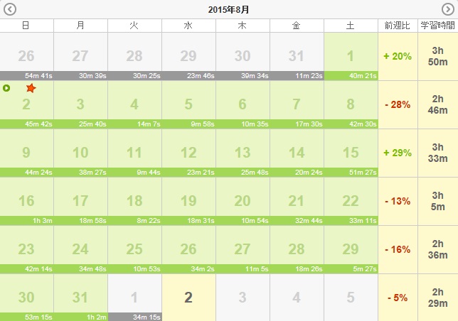 人気blogランキングへ気付いたら試験まで2週間を切った。最後の追い込みだ!昨日の大作は、無事完成。2時間鍋に張り付いた甲斐があった。写真は後日、、、8月24日(月):ラジオ120分・聞き流し80分8月25日(火):ラジオ135分・聞き流し80分8月26日(水):ラジオ120分・聞き流し80分8月27日(木):ラジオ135分・聞き流し80分8月28日(金):ラジオ95分・聞き流し80分8月29日(土):ラジオ90分・留学40分・予習復習60分8月30日(日):ラジオ30分・予習復習60分小計:1285分+Y156分=1441分累計:1441分+32982分=34423分※今までの総計15295分(2013年11月~2月)+5043分(2月~3月)+4933分(3月~4月)+8072分(4月~5月)+7919分(5月~7月)+15240分(7月~9月)+8793分(9月~11月)+20424分(11月~2月)+5413分(2月~3月)=91132分