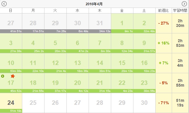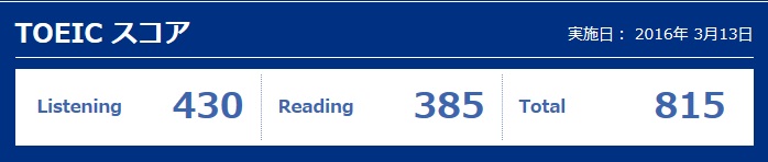人気blogランキングへ先月の試験結果が出た。昨年秋よりも下がっている。。。。やはりリーディングがまだまだなんだな、もっと読まねば。といっても、適当な本を適切に入手するのが難しい。本以外で読む機会を増やそう。弱点がわかれば、やるだけ。弱点と言えば、「瞬発力」強化の為、春から聞くラジオも少し変える予定。昨日と同じ事をやれば、昨日と同じ結果しか出ない。結果を変えるには、(今やっている事を続けつつ、)昨日と違う事をやらねば。3月28日(月):ラジオ5分・聞き流し80分3月29日(火):ラジオ5分・聞き流し80分3月30日(水):ラジオ95分・聞き流し80分3月31日(木):ラジオ125分・聞き流し80分4月1日(金):ラジオ125分・聞き流し80分4月2日(土):ラジオ90分・留学40分・予習復習60分4月3日(日):ラジオ95分・予習復習60分小計:1100分+Y150分=1250分累計:1250分+2795分=4045分※今までの総計15295分(2013年11月~2014年2月)+5043分(2月~3月)+4933分(3月~4月)+8072分(4月~5月)+7919分(5月~7月)+15240分(7月~9月)+8793分(9月~11月)+20424分(11月~2015年2月)+5413分(2月~3月)+37246分(3月~9月)+35761分(9月~2016年3月)=164139分