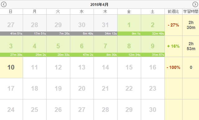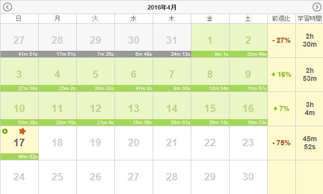 人気blogランキングへ最近、仕事の疲れは、勤務時間の長さとは比例しない事を痛感している。時間が短くても、内容が濃厚ならば疲労する。頭の切り替えが重要だ。仕事外で、仕事を引きずり過ぎないようにしよう。4月4日(月):ラジオ135分・聞き流し80分4月5日(火):ラジオ135分・聞き流し80分4月6日(水):ラジオ120分・聞き流し80分4月7日(木):ラジオ95分・聞き流し80分4月8日(金):ラジオ95分・聞き流し80分4月9日(土):ラジオ105分・留学40分・予習復習60分4月10日(日):ラジオ30分・予習復習60分小計:1275分+Y173分=1448分累計:1448分+4045分=5493分※今までの総計15295分(2013年11月~2014年2月)+5043分(2月~3月)+4933分(3月~4月)+8072分(4月~5月)+7919分(5月~7月)+15240分(7月~9月)+8793分(9月~11月)+20424分(11月~2015年2月)+5413分(2月~3月)+37246分(3月~9月)+35761分(9月~2016年3月)=164139分