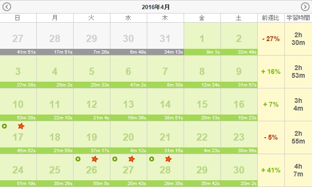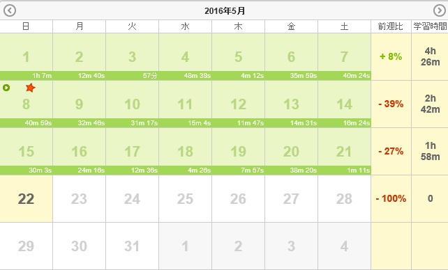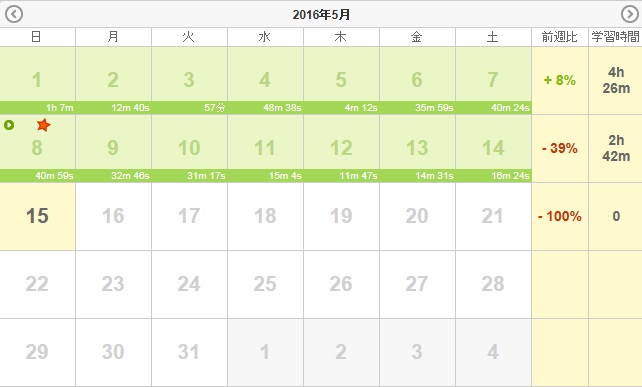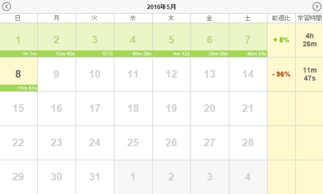人気blogランキングへ初期化したパソコン、画面が勝手に動いて非常に使いづらい。やはりこれも寿命なのか、、、、パソコン買い替えを早めることに。必要なものは、買わねばならない。ただ、出費は間違いなく痛いので、その分稼がねば。。。。5月2日(月):ラジオ135分・聞き流し80分5月3日(火):ラジオ155分・予習復習60分5月4日(水):ラジオ155分・予習復習60分5月5日(木):ラジオ115分・予習復習60分5月6日(金):ラジオ135分・聞き流し80分5月7日(土):ラジオ130分・予習復習60分5月8日(日):ラジオ40分・予習復習60分小計:1325分+Y266分=1591分累計:1591分+10269分=11860分※今までの総計15295分(2013年11月~2014年2月)+5043分(2月~3月)+4933分(3月~4月)+8072分(4月~5月)+7919分(5月~7月)+15240分(7月~9月)+8793分(9月~11月)+20424分(11月~2015年2月)+5413分(2月~3月)+37246分(3月~9月)+35761分(9月~2016年3月)=164139分