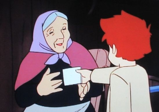おばあさんにハイジの手紙をおばあさんに渡すペーター。
