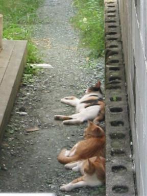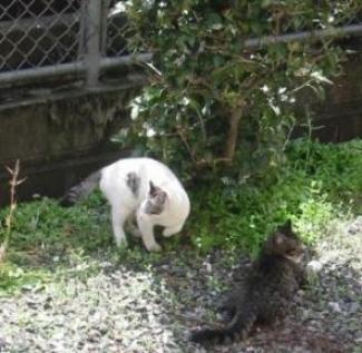 こたつに入っててふっと外を見ると塀に猫発見!塀の上で止まってる。うちにくるかなーと思ったけどこないみたい。先頭が茶白。↓この二匹のうちのどっちか。多分一番後ろのかな?手足に白が多かったし。蛇をやっつける子猫三匹。後を付いていく白ぶち。(あれ白ぶちの写真がないわねー)茶白が止まると白ぶちも止まる。茶白が尻尾をふわんふわん動かすとそれで玉とる白ぶち。かわいいーまた動きだす二匹。そして止まる。そして尻尾で玉とり。また止まった。今度は茶白がくるっと向きを変え白ぶちと向かいあう。そして茶白猫ぱんちを繰り出す。応戦する白ぶち。ぱしぱしぱしーとお互いに猫パンチを繰り出す。ひー、おかしー。腹いてー。可愛いーそしてまた歩き出す二匹。二匹いると猫パンチしあったりするからいいなー。と彼氏に報告。いやーいいもん見たよー。昨日はバイクで帰ってきたら横からマイケルがふんふん~って感じで歩いてきてた。私に気づいてないみたい。にゃーって私が鳴く真似したら、はっ!人!って感じで植え込みがあるからちょっと距離があるのに金網にジャンプして反対側に行っちゃったー。見事なジャンプに見惚れた。こないだは今日マイケルが行ってしまった敷地のアパートのとこに猫がいるのを発見!うわ、見たこと無い猫?二匹いる?とわくわくして眼鏡かけてみてみたら、三毛猫母さんが私に背を向けてくるっと顔を回して背中を舐めていた。。。三毛猫だから二匹分の模様はもってるよね。。。勘違いした自分にちょっと笑った。