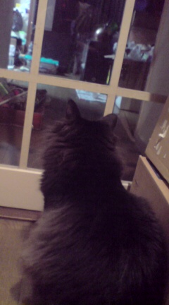 日曜日の夜に洗濯物を取り込む時に猫ちゃんが出てこないようにリビングの扉を閉めた。閉め出された猫ちゃん後姿を彼氏が携帯でパシャリ。