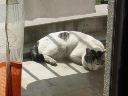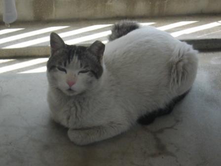 今日の白ぶちさんの出勤は11時頃。いないなーと思っててふっとベランダを見るとちゃっかり香箱で座ってる。。。猫ちゃんは籠で寝てるからまとわりつかれずにご飯をあげる。が、ご飯をあげた後に猫ちゃん気づいて窓の前に張り付き。ご飯食べた後日向ぼっこ。11時頃来たのに1時40分まで居ました。長時間滞在。時間が長かったのでうちの猫ちゃんも途中寝に行ったり。白ぶちは寝てるなーと思ったらちょっとづつ寝相が変わっていく。腹見せはしないけど安心して寝てる?ふっと見ると猫が起き上がったのでもう寝るのは終わり?と思ったら横から手が出てる。はあ?と思ったら黒白がベランダ上がってきて白ぶちにちょっかい出していた!寝てるとこを邪魔して起こしたのか?私が窓に張り付く黒白は逃げて外の木の下で日向ぼっこ。なんか後姿のお腹がどっしりしてるような。。。子供生まれる?白ぶち黒白を気にしつつも香箱で寝始めた。ガラス越しに見つめ合う。ご飯が欲しいのかなー?外に行ったらたまちゃんがいて、マイケルと白ぶちとちょい柄違いが一緒にいた。