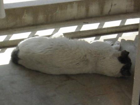 おくつろぎー。あー網戸が。。。同じような写真でごめんなさい。でも可愛いのー。ピンクの鼻と半開きの口がたまらんねー。食事中の白ぶちを見つめる猫ちゃん。シルエットがいいねー。日光浴ー。