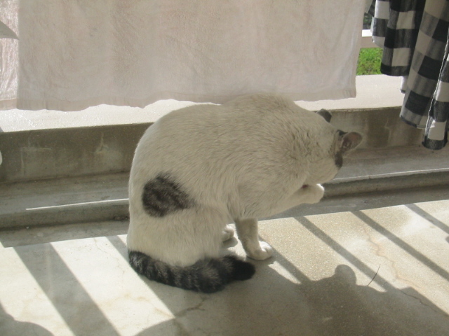 いよいよこないだ月曜に撮った白ぶちの写真の最後ですよー。外を見るあまりの開脚ぶりに。毛が短いからポーズが良くわかるわー。
