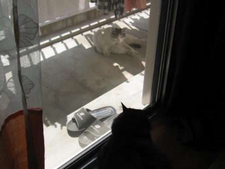 今日はカーテン開けたらもういた。猫ちゃんの視線を浴びつつ白ぶちにご飯をあげる私。白ぶちはカーテン開けたらやっぱり口をシャーって。あくびじゃないよねー?それが挨拶なのか?ご飯食べてベランダで寛いでるとこに洗濯物干しに行ったら右往左往。あせってベランダの塀にジャンプするしー。網戸越しなら平気なくせに。でれーん白ぶちがいていらいらするのか、噛み千切ったダンボールが転がってる。