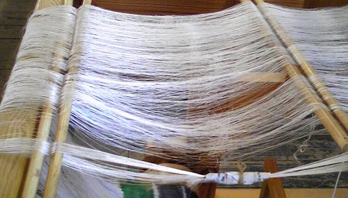 銘仙館に電話をしたら、今日は織りの先生がいらっしゃるというので行って来ました。機結びは完了していたので、それを引っ張って、固定してもらうことに。ところが、前の織り終わりの糸が(古くて?)結構切れていて、それを見つけて綜絖通し、筬通しをするのが大変。最初は、その糸がどこの糸なのか、発見するのが大苦労。コツを教わりながら、やっているうちに、少しづつ糸の筋と言うか、見えるようになって来ました。試しに、織ってみると、怪しいところを発見。そこで時間切れ。明日以降、また織りの先生がいる日を見つけて行こうと思います。なかなか、織り始められないものなのですね。