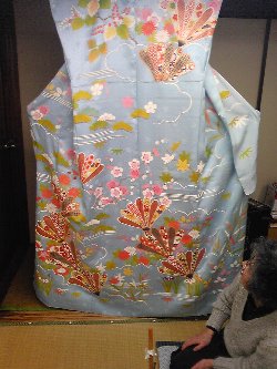 先生が仕立てている振袖生徒の一人が、お嬢さんの為に購入したものです。本当はご自分で仕立てる予定でしたが、急な家庭の事情で間に合わない見通しになり、先生に頼むことに、、、、。とてもステキな高級感あふれた振袖なのですが、柄合わせがとても大変です。先生をしても、かなり気を使うようです。おくみ付け、背、脇は当然のこと、衿もきれいに柄が合わされています。なんと、おくみと裏おくみ 袖の振りと振り布まで柄合わせがあります。写真は、振り布の柄合わせ。振り布が付く振袖も多くは無いですが、ここまで柄合わせが必要な物はもっと少ないそうです。本人の寸法に合わせて仕立てる他に、柄を全て合わせるの言うのは、もちろん当たり前のことなのですが、この方は、小柄で細身の方なので、また、工夫やご苦労があるようです。仕立てあがったら、それは見事な振袖になりそうです。