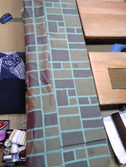 卒業制作の銘仙、色違いの玉虫銘仙。小川の展示が終わって、いよいよ仕立て始めます。今日は柄合せ。丈が充分にあるので、気は楽です。左は、上前と衽の柄合せ。 右は、背中の柄合せです。裁ち台の上で見積もり(寸法を図り)ながら、見栄えの良い柄合せを見つけていきます。この柄合せだけで、ほぼ一日、終わってしまいます。下は、和裁の先生の、孫娘さんの飼い猫 メタボちゃん。