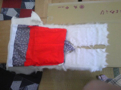 ブログの書き込みが遅くなりましたが、ちゃんちゃんこ、完成しています。他の生徒の進行状況を見ながら日程調整して、しばらく、他の作業にかかっており、実際の綿入れは、10月下旬になりました。裏返しにして、綿を開いて入れます。ひっくり返しながら、あちこちに綿を詰め、背縫いと待ち縫いのところに綴じを入れていきます。3枚とも、綿が入りました。衿つけの所を綴じます。衿先の処理をして、衿をくけます。その後、あちこち綿をとめる隠しぬいを入れます。赤い衿をつけて、紐をつけて、肩揚げをとって、完成~。出来上がりは11月下旬。何とか本格的な冬になる前に出来ました。喜んでいただけたようで、可愛い画像を貰いました。本当は、笑顔もとてもキュートなのですけど、残念ながら非公開です。