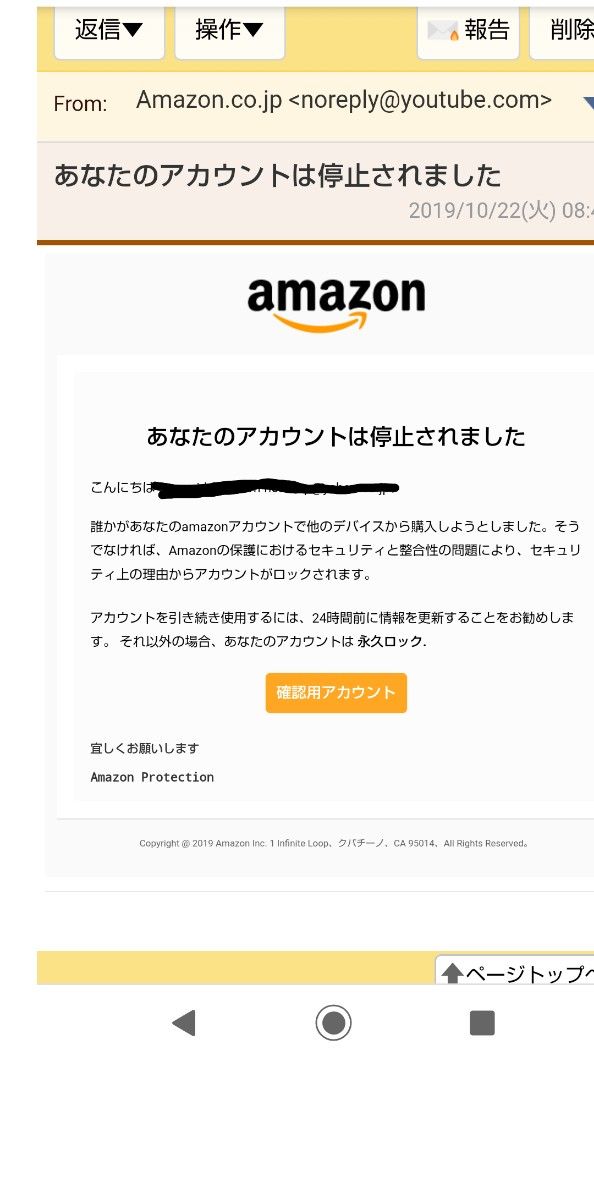 メールチェックをしていたら、Amazonからメールが届いていた。アカウントが停止されるとな!?なんじゃこれちょっと焦って確認用アカウントをクリックしてみたけど、メールアドレスとパスワードを入力する画面がポツンと表示されるのみ。あれ?これ、怪しい?とググってみたら、はい、完全に詐欺メールでした。危ない危ない。念の為Amazonを覗いて見たら普通にログイン出来ました。どこからアドレス漏れたかな…よく見れば、送信アドレスが絶対Amazonのアドレスじゃないよね。アカウントが停止とか、人を慌てさせることで、冷静な判断が出来なくなるようにしているのね。 皆様もお気をつけ下さい