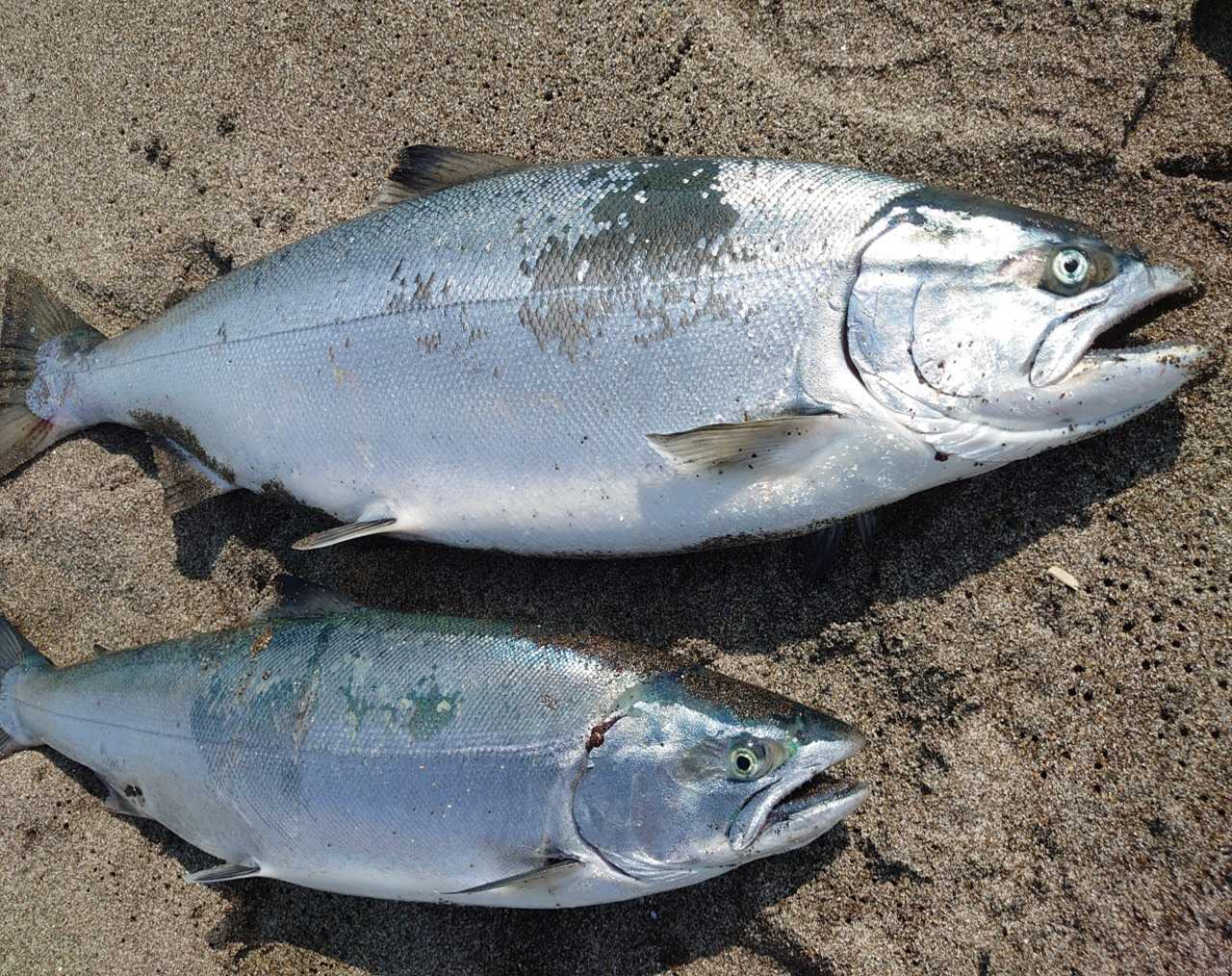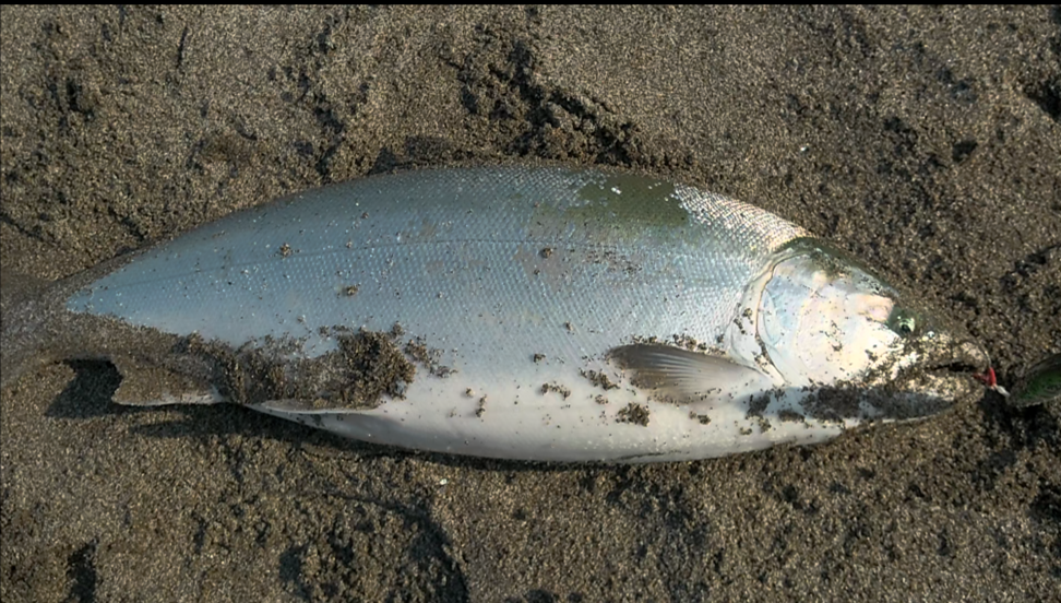 手前の波の中にはチビアメなのか、サケ稚魚なのかチビ魚がずっとチラチラ見えてる状況。
